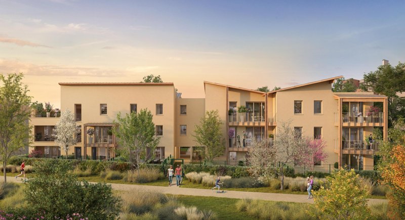 Cette résidence neuve située à Borderouge comprend 48 logements répartis sur deux bâtiments organisés autour d’un jardin paysager. Conçue par EMPAN Architectes, elle associe architecture contemporaine et références au passé maraîcher du quartier, avec façades minérales, bois apparent et toitures inclinées. Les appartements, du T2 au T5 (environ 37 à 100 m²), disposent tous d’un espace extérieur et, pour certains, d’une double orientation favorisant lumière naturelle et ventilation.