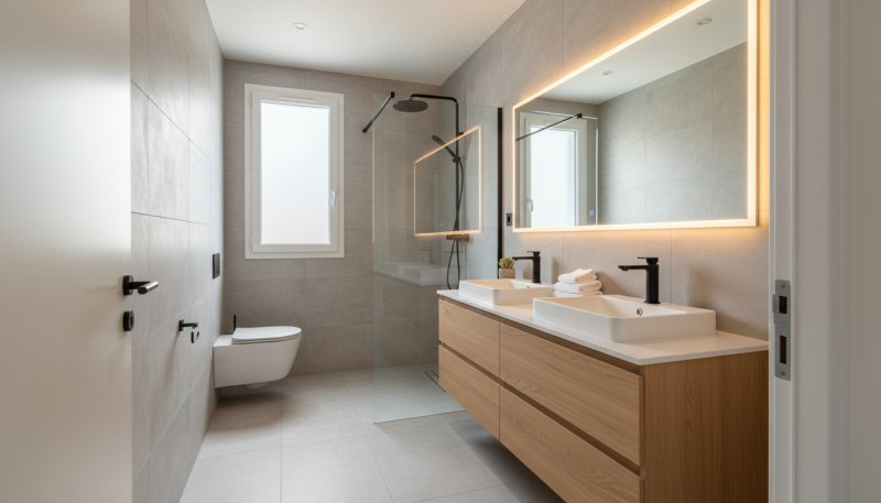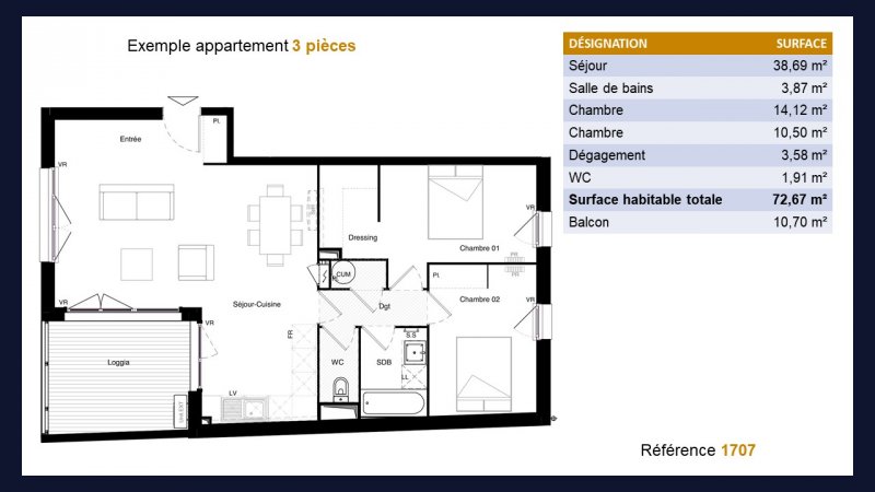 Les finitions comprennent carrelage 45x45 cm dans les pièces de vie, parquet stratifié dans les chambres, peinture lisse, placards aménagés, volets roulants électriques, meuble de salle de bains avec sèche-serviettes. Le confort technique repose sur une installation tout électrique avec ballon thermodynamique, climatisation réversible, thermostat d’ambiance et serrure 3 points, complétée par une pompe à chaleur et des panneaux solaires. Ascenseur, local vélos, interphone Vigik et autres équipements facilitent le quotidien des résidents.