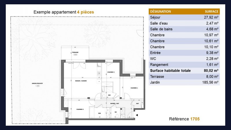 Les logements, de 42,6 m² à 80,0 m², privilégient la luminosité et disposent tous d'un espace extérieur (jardin, terrasse ou balcon). Les prestations sont soignées et performantes (norme RE2020, chaudières individuelles, double vitrage, salles de bains équipées). La résidence est sécurisée (Vigik, visiophone), dotée de parkings, d'un local vélo et d'un cœur paysager.