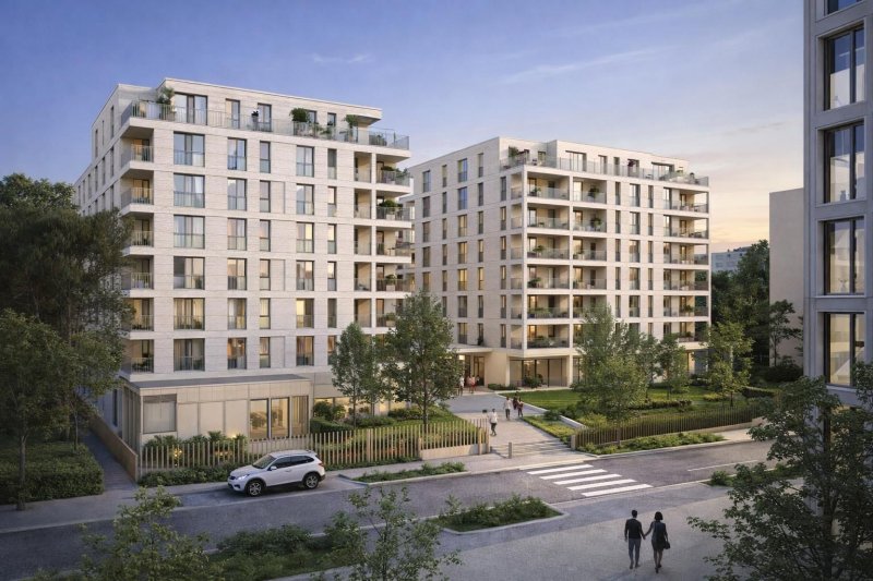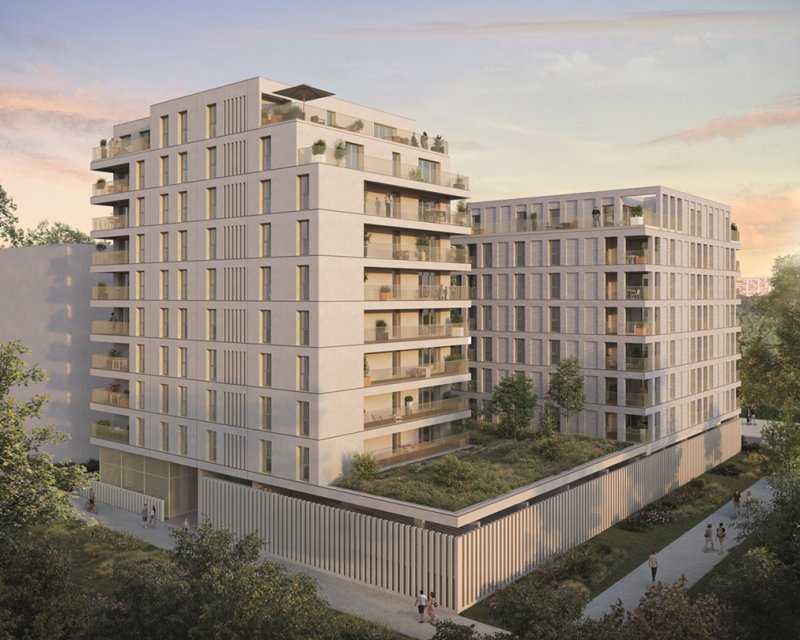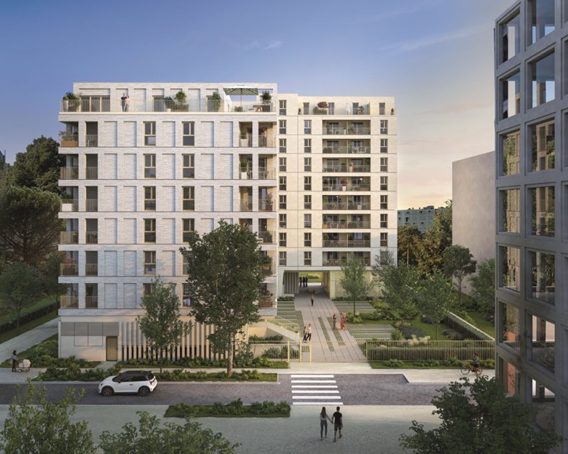 Conforme RE2020 seuil 2025, le projet intègre pompe à chaleur, isolation renforcée et toiture végétalisée avec arbres sur dalle. La résidence vise la certification NF Habitat HQE et s'inscrit dans une démarche Effinature. Stationnements en sous-sol avec vidéosurveillance, local vélo sécurisé, ascenseurs et interphone Vigik complètent les équipements.